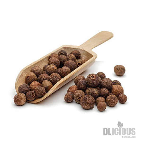 La pimienta de Jamaica en grano es una especia aromática obtenida de las bayas secas del árbol Pimenta dioica, originario de América Central. Su nombre proviene de su sabor que combina notas de canela, clavo, nuez moscada y pimienta, sin ser picante como esta última. Se usa para sazonar platos salados y dulces, como guisos, sopas, carnes, postres y repostería.